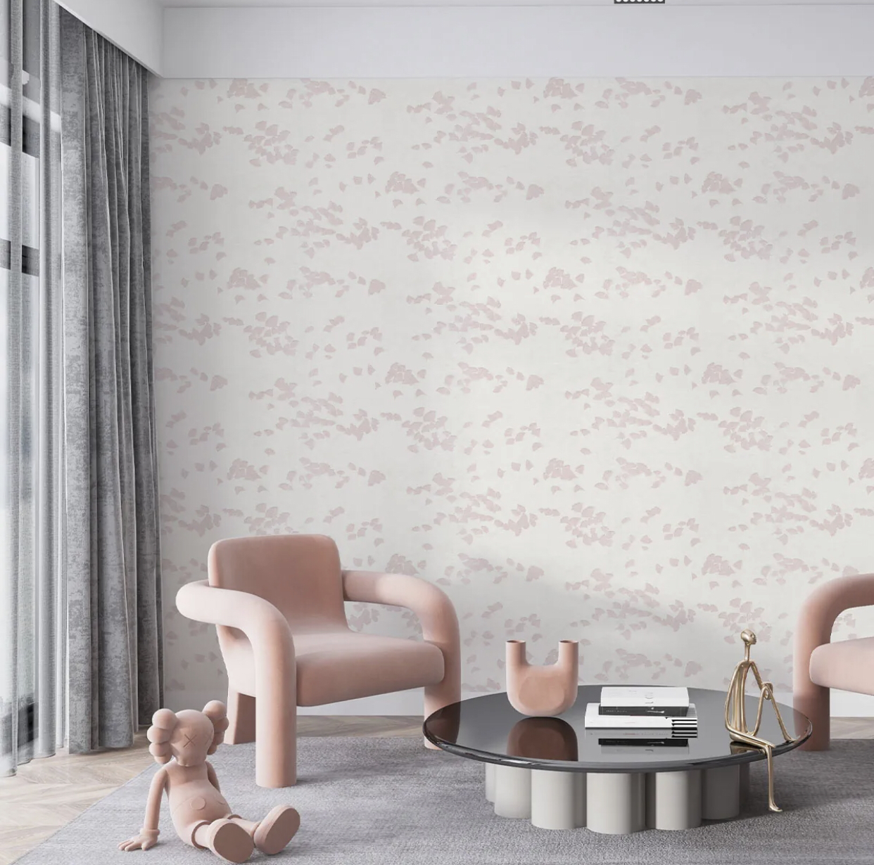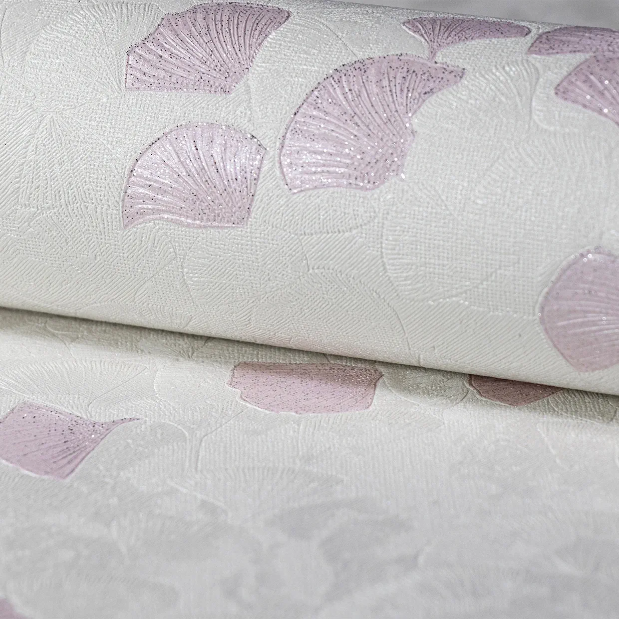 نمای نزدیک از کاغذدیواری طرح گل بادبزنی با دانه‌های اکلیلی در دو رنگ صورتی ملایم و طلایی مجلل